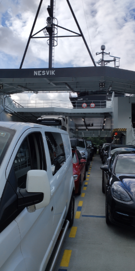 La route est belle, il pleuvine, mais ça passe. Vers 10h30 on doit prendre un ferry pour arriver à Nesvik (- non pas Nesquik). La traversée dure un petit quart d’heure, le temps de faire un petit pipi et de prendre quelques photos.