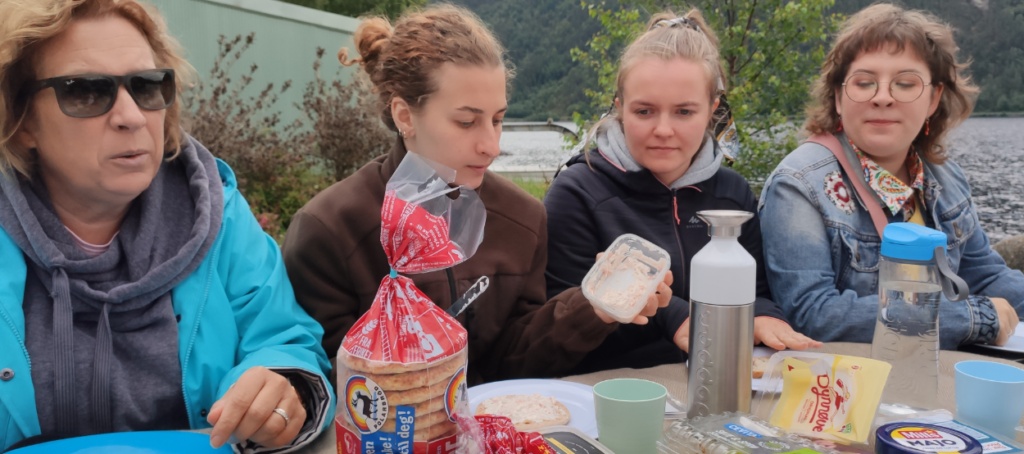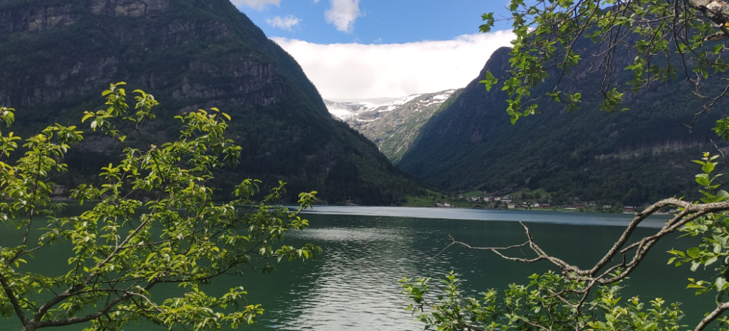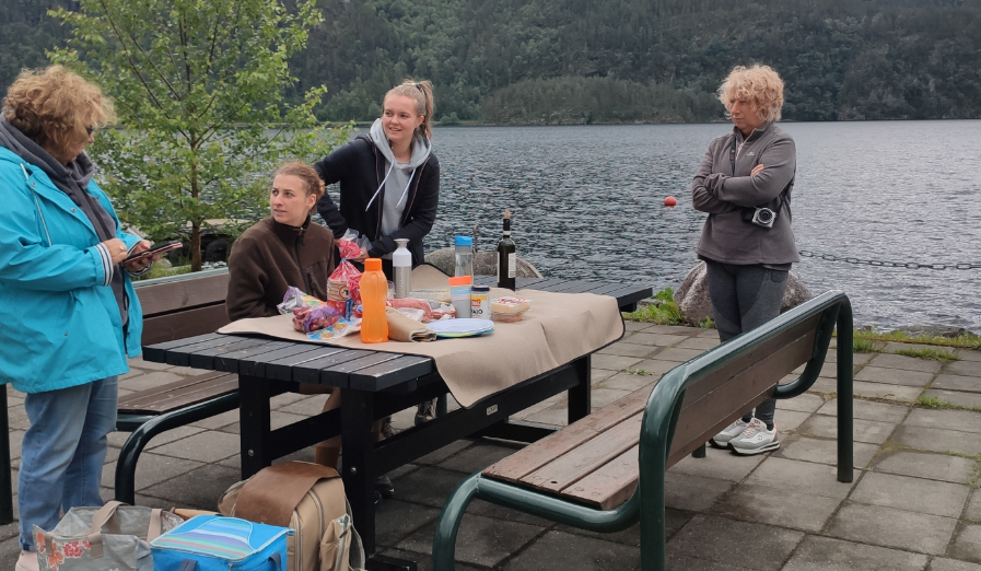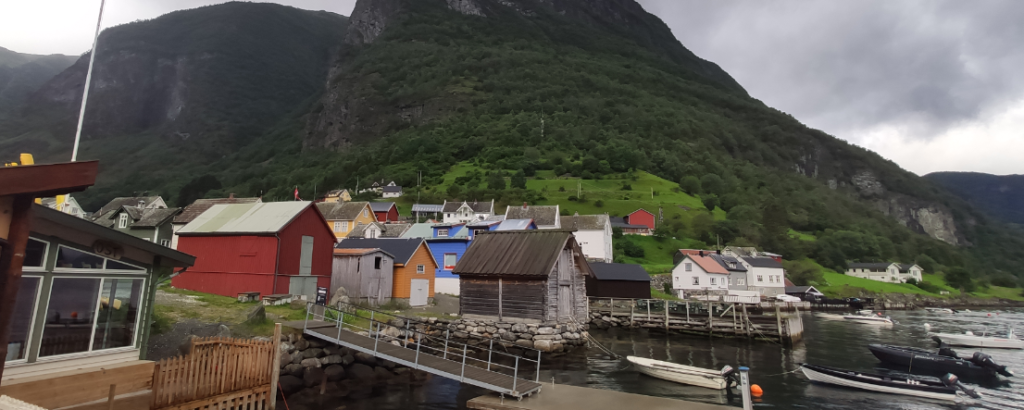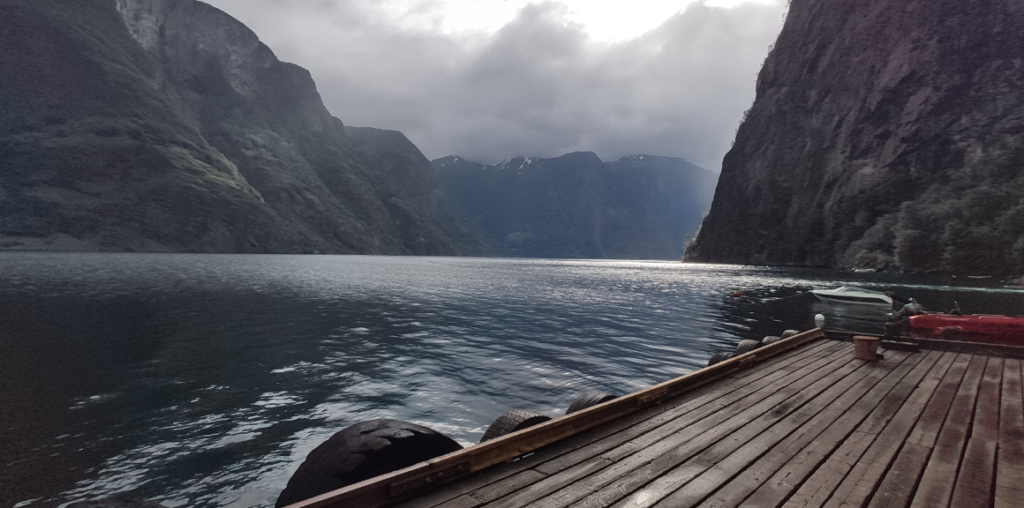 On se dirige vers l’eau (le Sognefjord qui est le fjord le plus long d’Europe) et on trouve le seul banc de pique nique couvert… Trop de chance non?
