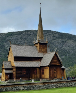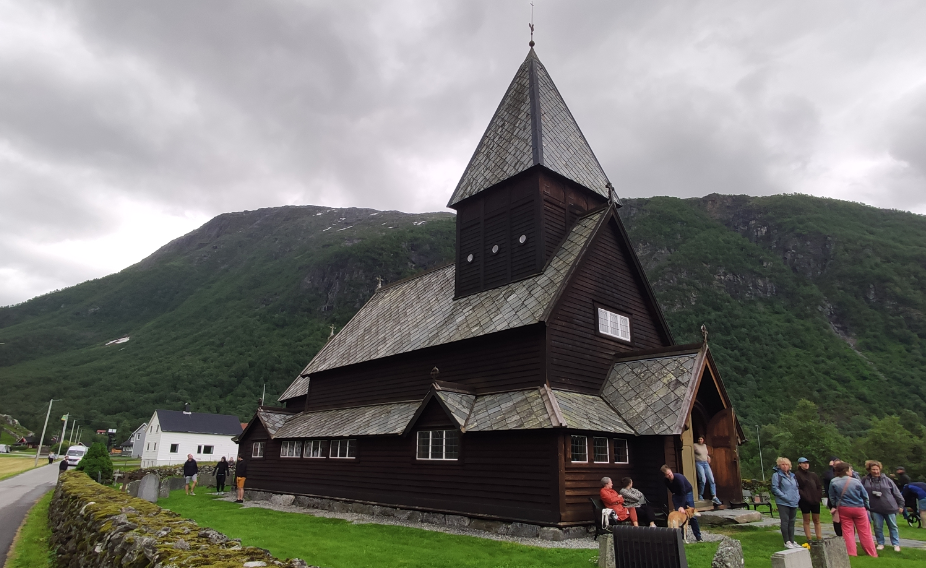 Dès que la pluie arrive on reprend la route et on arrive vers 14h à Røldal. Et qu’est ce qu’il y a à Røldal? Une vieille église médiévale en bois – une stavkirke – que dit notre ami Wikipedia? : On les appelle en français les « églises en bois debout » car des mâts ou poteaux sont utilisés pour soutenir le toit et l’élévation de la nef, mais aussi élever les murs. On a répertorié environ 1 300 églises médiévales, dont 28 ont été sauvegardées en Norvège.