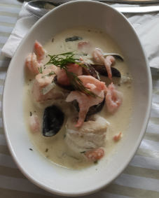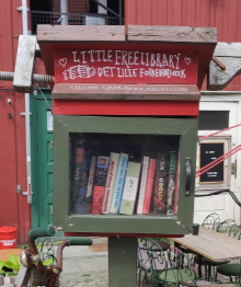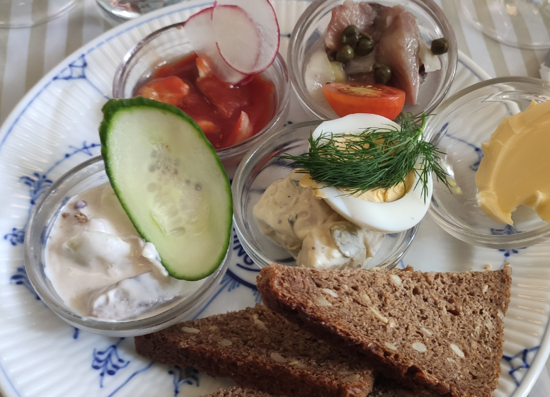 On se retrouve au Baklandet Skydsstation, un petit resto dans le Baklandet (c’est le nom du quartier), maisons colorées, rues étroites. Au menu trio de harengs pour certains, soupe de poissons pour d’autre et sandwich burger purée de pois et oeuf pour Natty.
