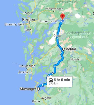 Le trajet du jour : on remonte jusqu’à Stavanger (la 3ème ville de Norvège – où on restera 2 nuits)