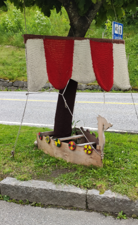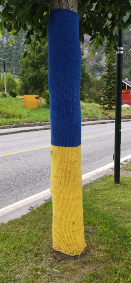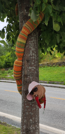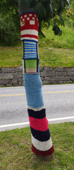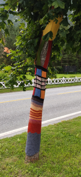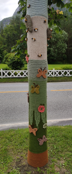On retournant à la maison, petit arrêt à Eidfjord où il y avait de chouettes tricots autour de certains arbres.. des arbres emmitouflés :