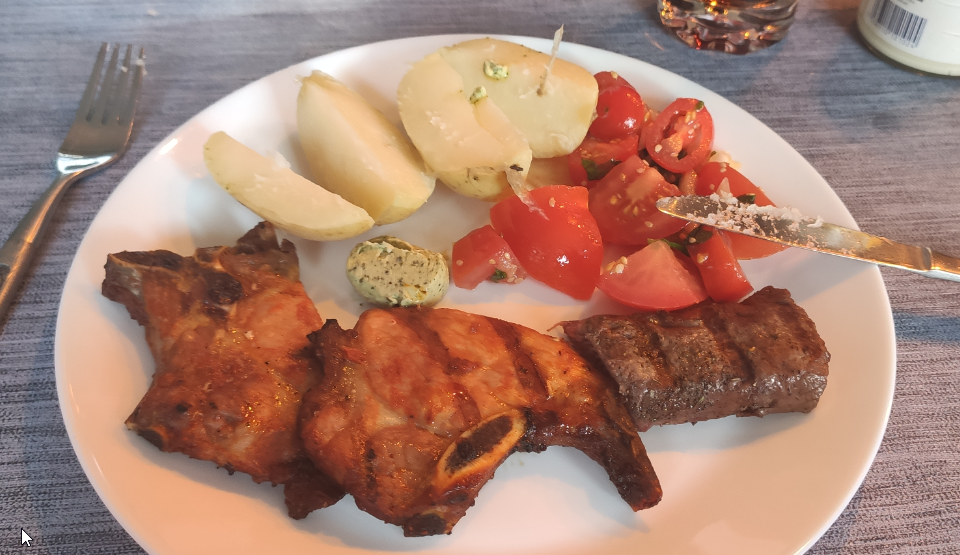 Au menu du soir, on avait donc : côtes de porc marinées, pdt, beurre à l’ail, salade de tomates, épi de maïs et du renne – Oui après la baleine d’hier, voici le renne aujourd’hui, et bien c’est très bon, je m’attendais à une viande plus forte mais en fait non, c’est très tendre, beaucoup de saveur, vraiment pas mal !