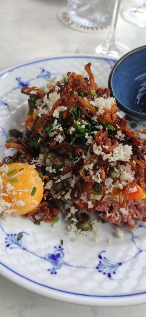 Bref on trouve un petit resto, un petit tartare classique (c’est son nom mais en vrai c’est pas du tout classique, un peu sucré salé mais finalement ça passe plutôt bien) pour moi. Poitrine de boeuf, crème de raifort pour Nath, filets de carrelet pour Coco