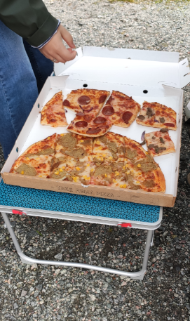 Vers 12h30, on s’arrête sur le bord de la route et on se confectionne un petit abris entre les 2 coffres des voitures avec un bâche et une corde, comme il pleut légèrement et on déguste les pizzas froides de la veille (et bien c’est pas si mauvais les pizzas froides – surtout avec un petit verre de blanc)