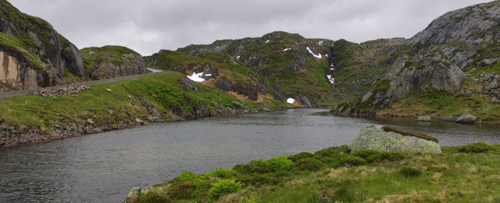La route est sympa jusque Sinnes et ensuite, elle est vraiment belle jusque Lysbotn. On croise régulièrement des moutons sur le bord du chemin (ou même sur le chemin de temps en temps – faut faire gaffe !)