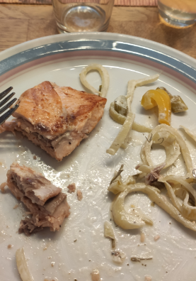 Retour à la maison, un petit apéro et ensuite repas beaucoup plus équilibré que les derniers jours : ‘Saumon sur lit de fenouil du jardin de Natty’ – Mmmh, ça s’annonce bien