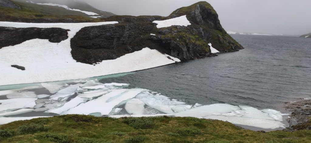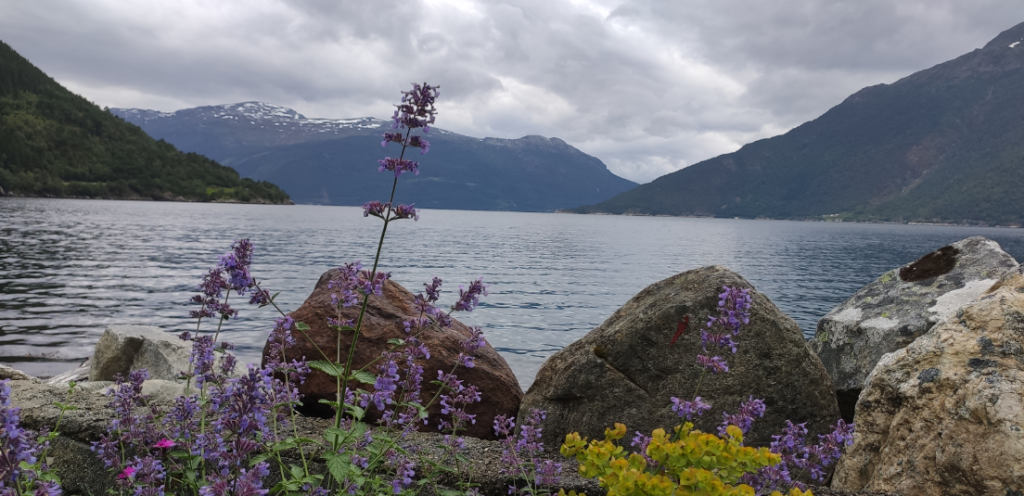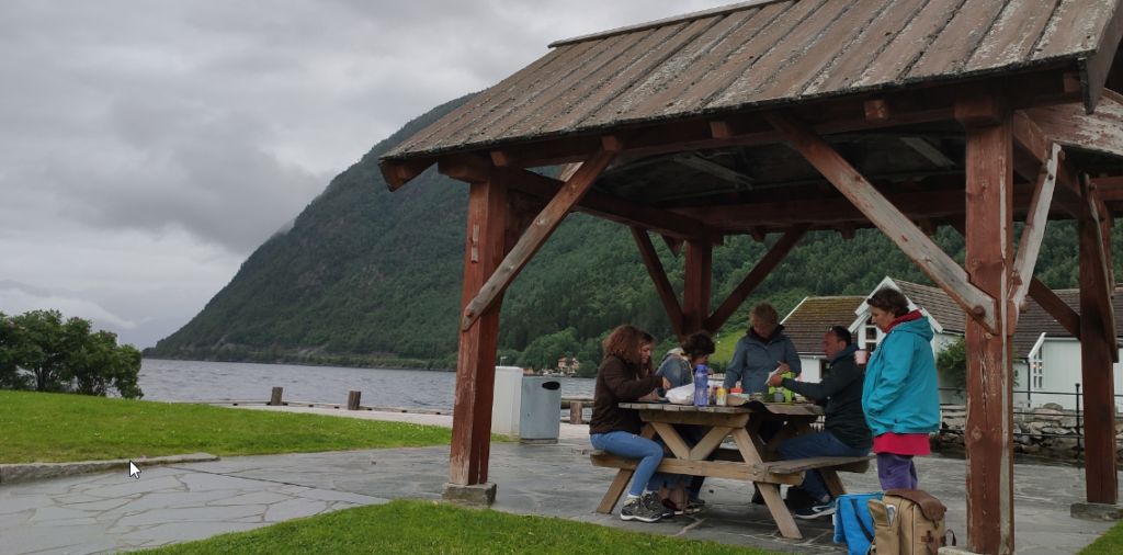 On se dirige vers l’eau (le Sognefjord qui est le fjord le plus long d’Europe) et on trouve le seul banc de pique nique couvert… Trop de chance non?